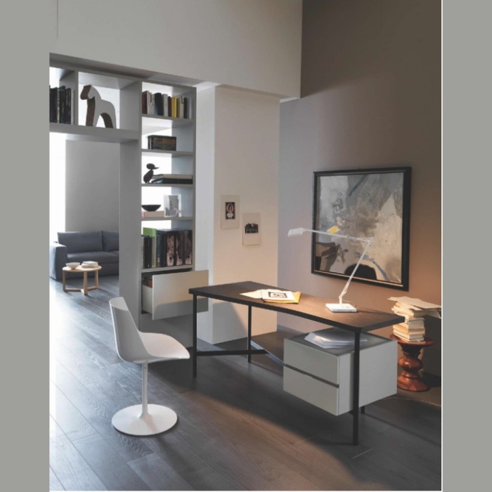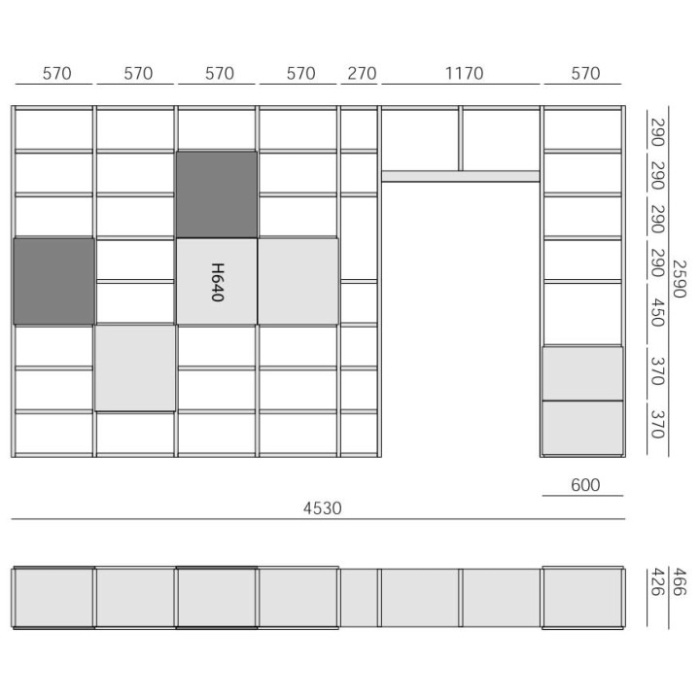 struttura bifacciale con fianchi e ripiani da 30 mm di spessore laccati grigio corda opaco