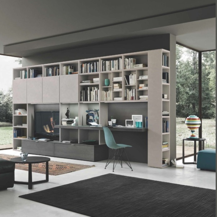 Struttura: (fianchi, divisori, schienali) materici ed essenze con venatura orizzontale - (ripiani) materici ed essenze con venatura orizzontale.Frontali: materici con venatura orizzontale fino ad altezza 1916 mm. Essenze con venatura orizzontale per i roveri tinti e noce o con venatura verticale per il rovere termotrattato.
