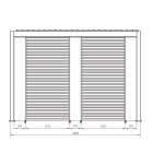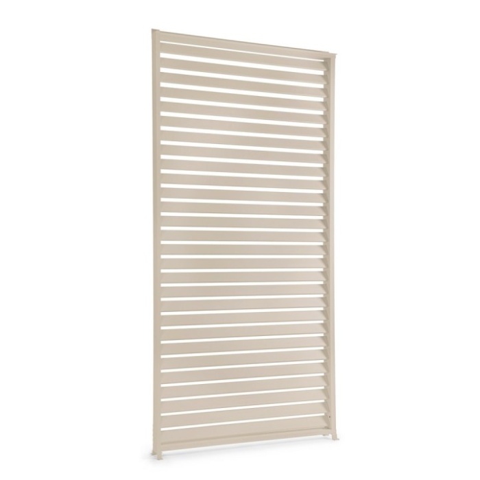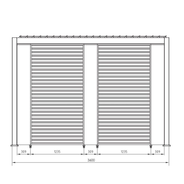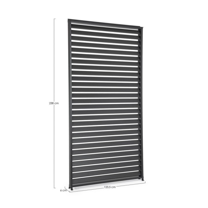 La struttura è composta da pali portanti da 60x25 mm e lame frangisole fisse da 65x15 mm, che permettono una schermatura visiva efficace senza bloccare completamente il passaggio di luce e aria. Il sistema di fissaggio alla pergola avviene tramite viti auto-foranti, incluse nella confezione, per un’installazione sicura e rapida.