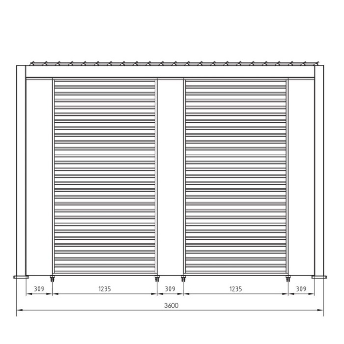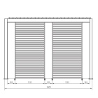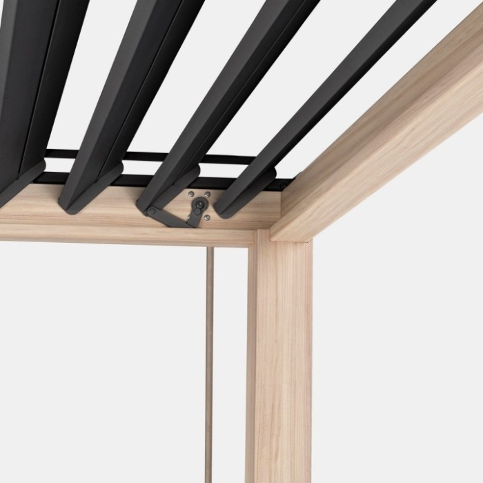 Grazie ai pali portanti da 111x111 mm e ai traversi da 140x75 mm, la pergola offre un’ottima stabilità. Il tetto lamellare è composto da lame frangisole a doppio strato da 173x30 mm, orientabili con una pratica manovella per modulare l’ombreggiatura in base alle condizioni climatiche e al comfort desiderato.