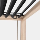 Struttura in alluminio. Tetto lamellare verniciato a polvere (poliestere), orientabile tramite manovella. Lame frangisole a doppio strato. Pali portanti e traversi con applicazione di film in PVC (foglio laminato ad alta tecnologia) stampato in 3D effetto legno venato. Sistema di deflusso dell’acqua integrato all’interno dei pali portanti. Viteria in acciaio inossidabile.