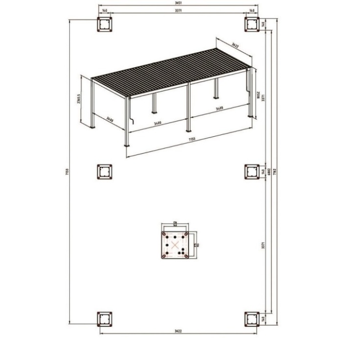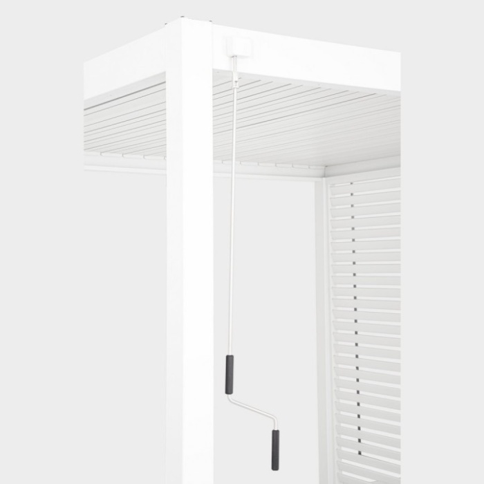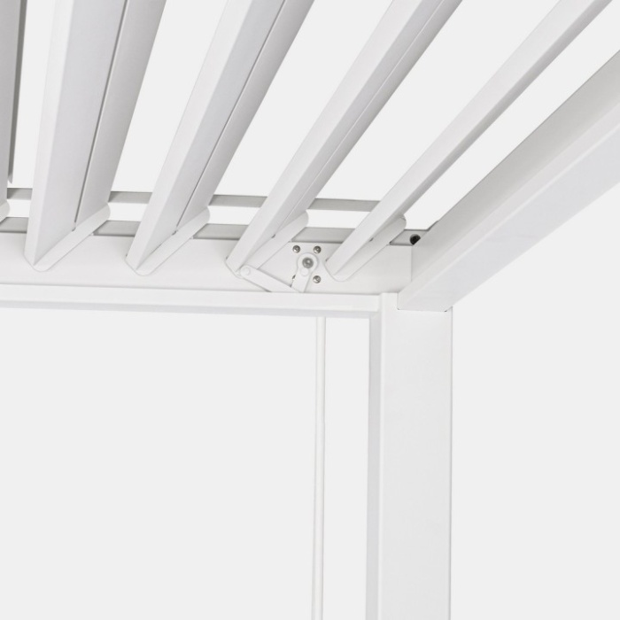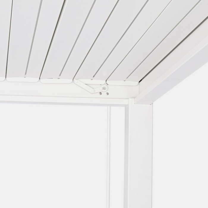 Alluminio verniciato a polvere (poliestere). Tetto lamellare orientabile tramite manovella. Lame frangisole a doppio strato. Sistema di deflusso dell’acqua integrato all’interno dei pali portanti. Viteria in acciaio inossidabile.