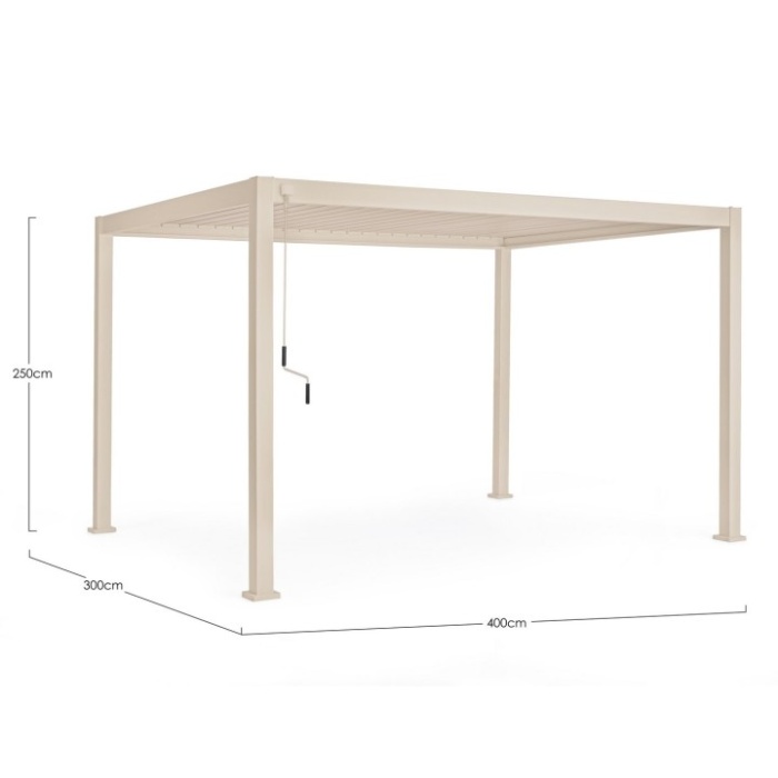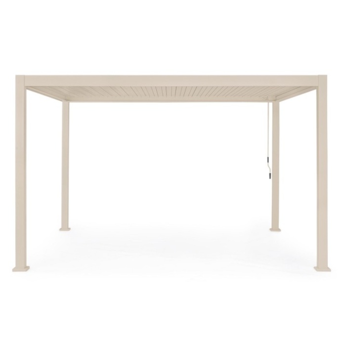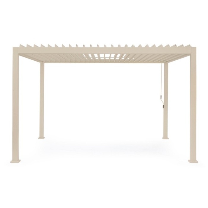 Alluminio verniciato a polvere (poliestere). Tetto lamellare orientabile tramite manovella. Lame frangisole a doppio strato. Sistema di deflusso dell’acqua integrato all’interno dei pali portanti. Viteria in acciaio inossidabile.