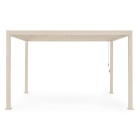 Struttura in alluminio verniciato a polvere (poliestere) con tetto lamellare orientabile tramite manovella e lame frangisole a doppio strato. Sistema di deflusso dell’acqua integrato nei pali portanti. Dotata di striscia LED RGB (293 luci – 250W/24V) da applicare all’interno dei traversi superiori.
