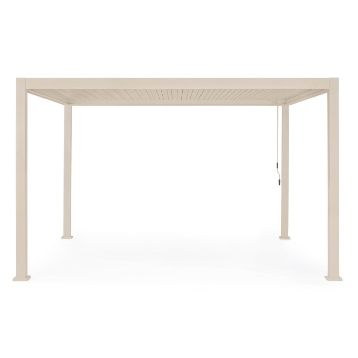 Il tetto lamellare orientabile è dotato di lame frangisole a doppio strato da 173x30 mm, regolabili manualmente tramite manovella per gestire luce, ombra e ventilazione in ogni momento. Il sistema di deflusso dell’acqua è integrato nei pali, garantendo funzionalità e pulizia estetica.