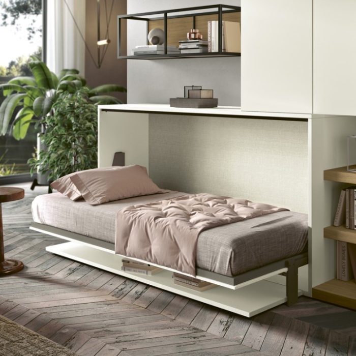 L’anta a ribalta nasconde due allunghe estraibili che offrono un comodo piano d’appoggio, ideale per lo studio e lo smart working.