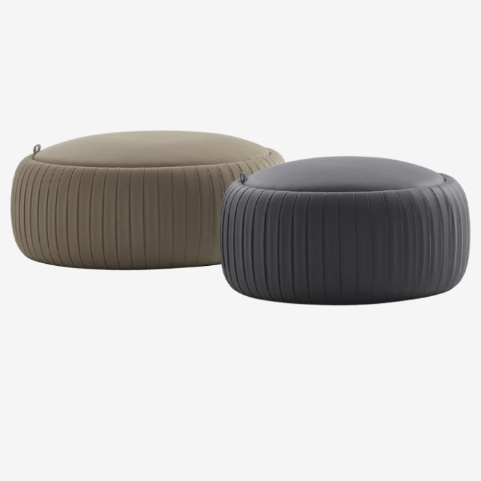 Plissé può offrire sia le funzioni di un tavolino con piano in vetro temperato, sia quelle di un comodo pouf contenitore. Disponibile in due versioni, si caratterizza per la plissettatura effettuata a mano su eco-pelle. La scelta di un tessuto ecologico si fa ancora più interessante grazie al vastissimo numero di colorazioni disponibili.