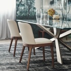 Sedia Magda di Cattelan Italia realizzata con struttura in frassino naturale (frN), frassino tinto noce Canaletto (frNC), frassino tinto rovere bruciato (frRB), frassino laccato poro aperto nero (fr73) opaco. Seduta e schienale rivestiti in tessuto, micro nubuck, ecopelle o pelle come da campionario. Non sfoderabile. (Disponibile anche in versione con braccioli e sgabello).