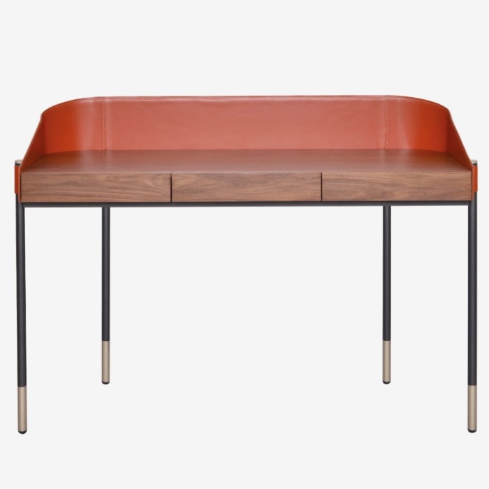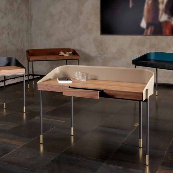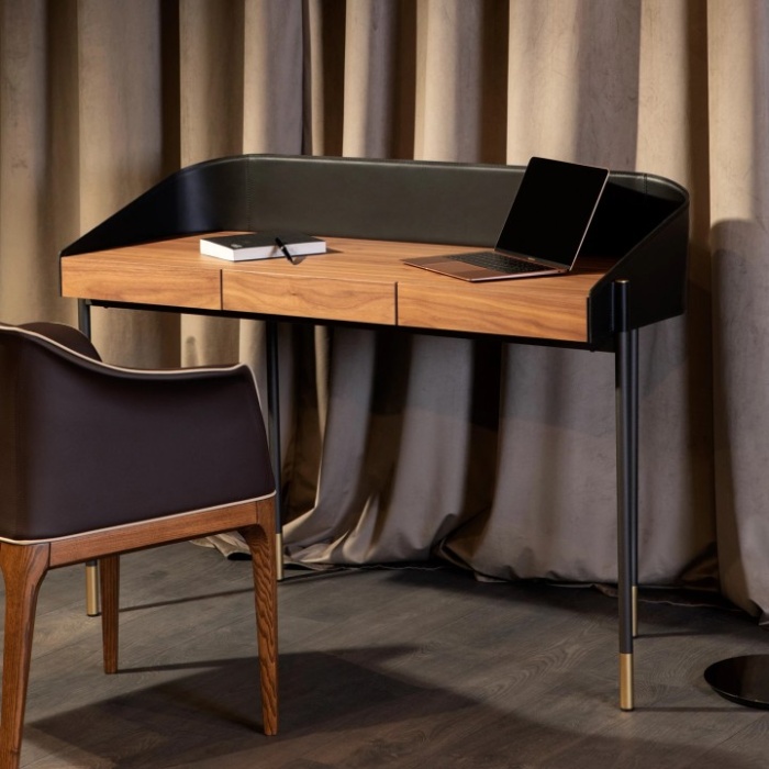 Lo scrittoio Ledor è un arredo elegante e funzionale, capace di unire raffinatezza estetica e solidità strutturale in un’unica soluzione.Il suo piano in legno disponibile nelle pregiate finiture noce canaletto o frassino nero esprime robustezza e calore, mentre il rialzo del top in cuoio aggiunge un dettaglio sofisticato che arricchisce il design con un tocco di classe senza tempo.