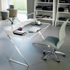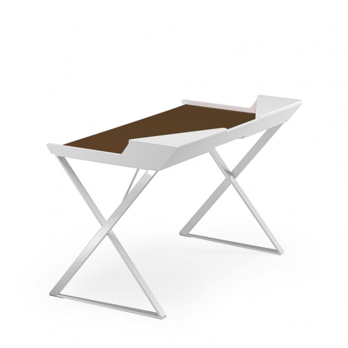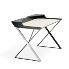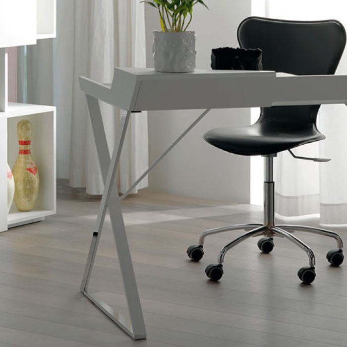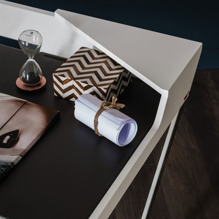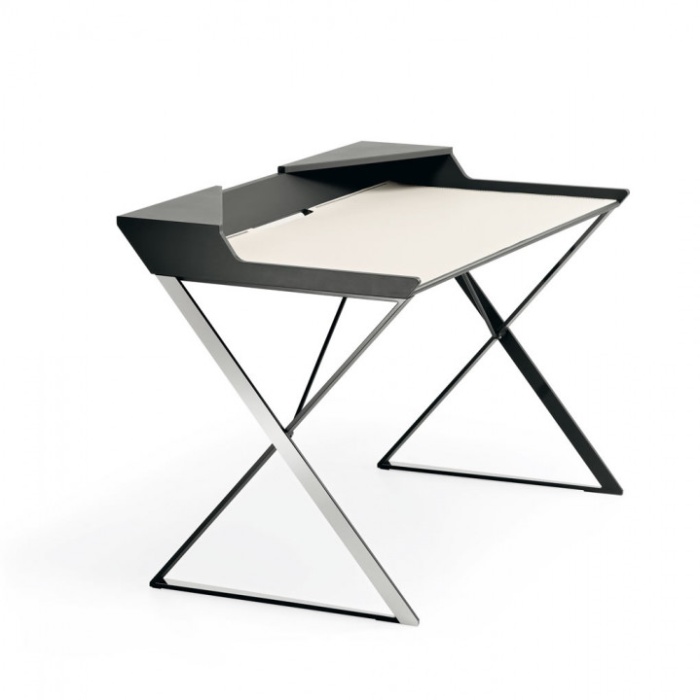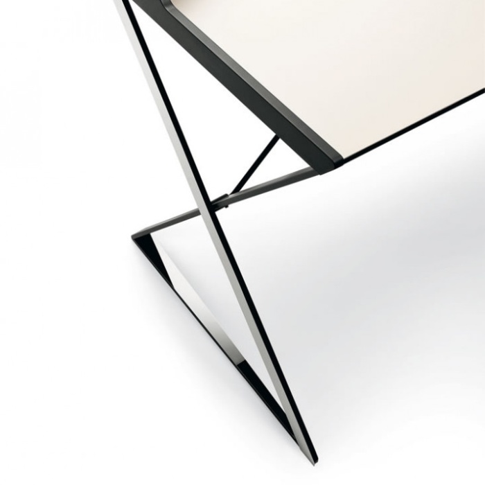 Qwerty è uno scrittoio moderno dalle dimensioni compatte, progettato da Andrea Lucatello per integrarsi con naturalezza in un home office o in un raffinato angolo lettura. Il suo design si distingue per le linee geometriche e controllate, che trasmettono una sensazione di equilibrio studiato e di leggerezza visiva. La struttura, infatti, sembra quasi sospesa: il piano in acciaio appare fluttuare sopra le gambe sottili incrociate a X, un dettaglio che dona dinamismo e un carattere contemporaneo alla composizione.