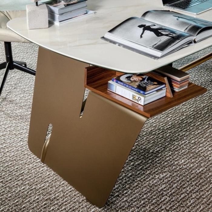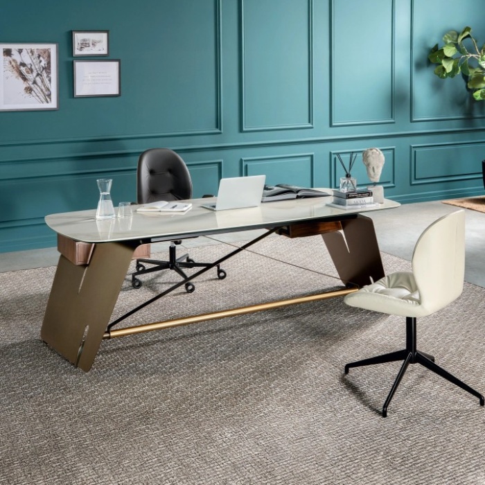 La scrivania direzionale Bridge è un complemento d’arredo prestigioso, pensato per chi desidera unire eleganza, funzionalità e rappresentanza nello spazio di lavoro. Le sue ampie dimensioni offrono un piano confortevole e raffinato, impreziosito da un top in porcellanato che garantisce resistenza e pregio estetico. Le finiture in bronzo e oro satinato donano un tocco di lusso discreto, rendendo questa scrivania un autentico simbolo di stile contemporaneo.
