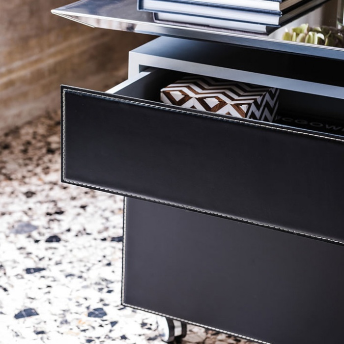 La cassettiera è un pratico optional anche per la versione standard, senza dattilo, della scrivania moderna Vega. I due pratici cassetti sono arricchiti da un frontale in cuoio pregiato.