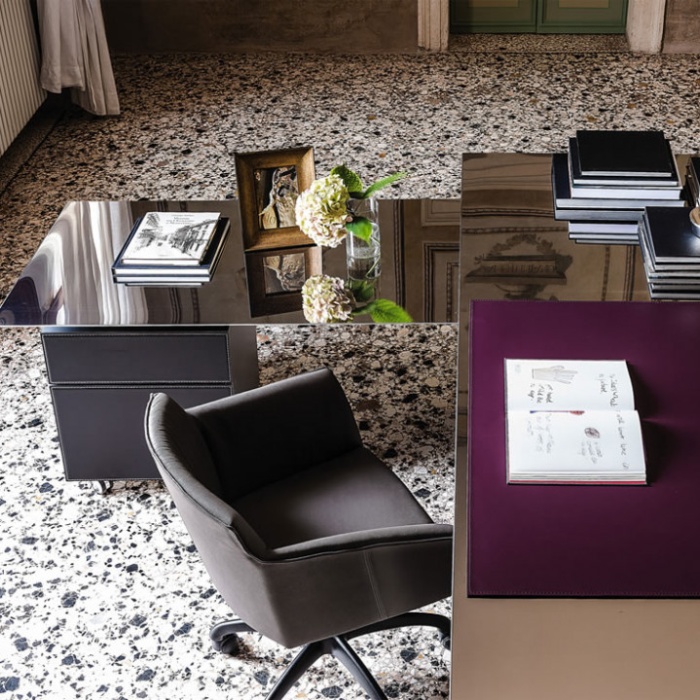 La struttura è rivestita in pregiate essenze di legno, mentre l'interno è verniciato graphite opaco. Un pad in cuoio, disponibile in diversi raffinati colori, completa il piano rendendolo confortevole ed elegante.