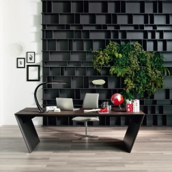 Scrivania in MDF laccato titanio (GF11), graphite (GF69) o nero (GF73) goffrato fine. Piano in ceramica Marmi nei colori Alabastro (KM02), Supreme (KM03), Ardesia (KM04), Golden Calacatta opaco (KM05), Golden Calacatta lucido (KM06), Portoro opaco (KM07), Portoro lucido (KM08), Sahara Noir lucido (KM09), Emperador (KM10), Makalu (KM11), Breccia (KM12) o Arenal (KM13).