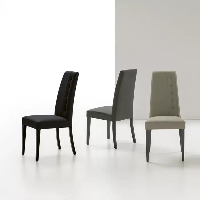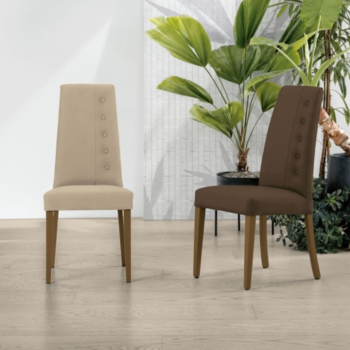 Le sedie moderne da sala Bellinzona hanno un design peculiare ed elegante, che si adatta anche ad arredamenti classici, che si esplica nel dettaglio dello schienale alto con una linea di cinque bottoni laterali: sono dettagli apparentemente semplici ma che rendono le sedie Bellinzona immediatamente distinguibili. Solida struttura in legno e comoda seduta in morbida ecopelle Easy-Touch.