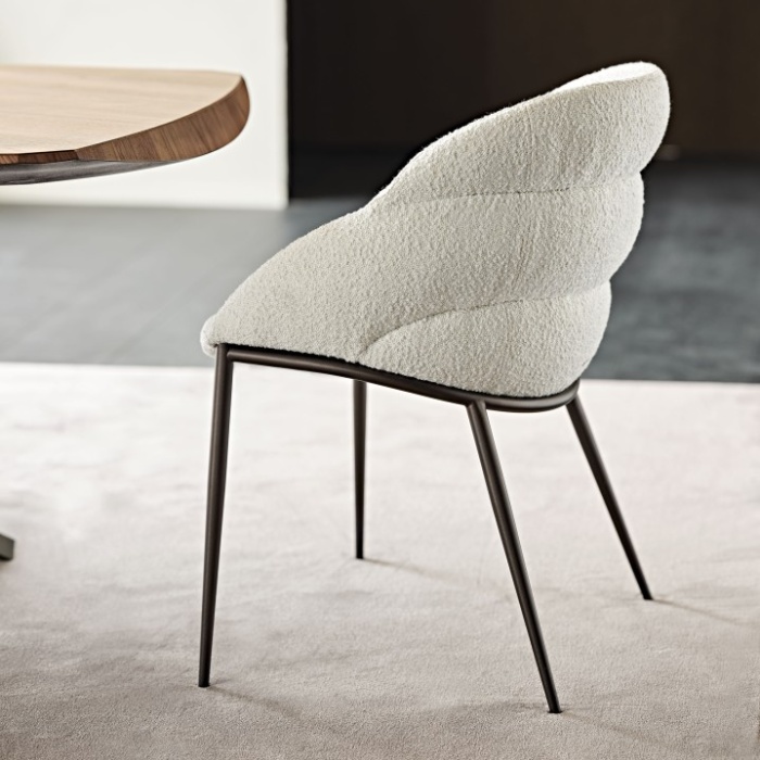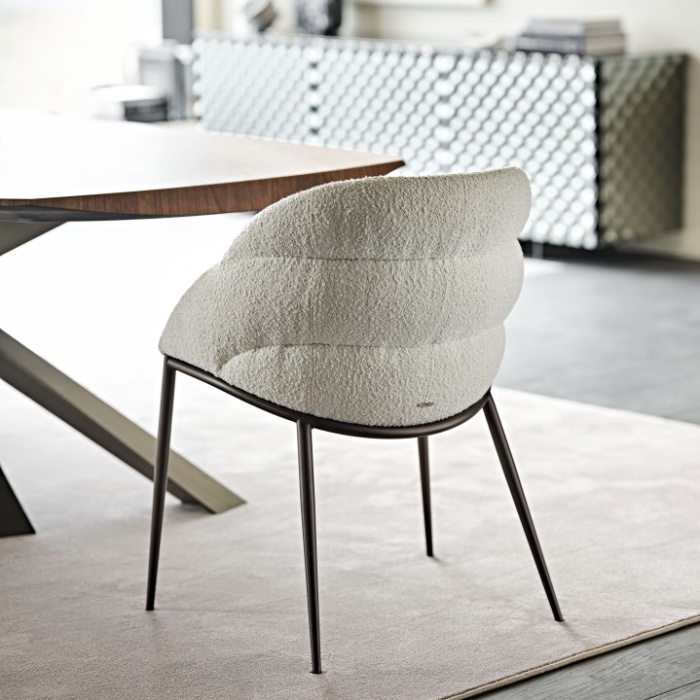 Un design dalle linee sinuose, che avvolgono il corpo, sostengono la postura e rendono la sala da pranzo moderna un ambiente accogliente in cui sentirsi a casa. La famiglia di poltroncine e sgabelli Camilla è il perfetto esempio di sedia con braccioli imbottita che completa una stanza con la delicatezza e la sensualità che si desiderano in un ambiente residenziale.