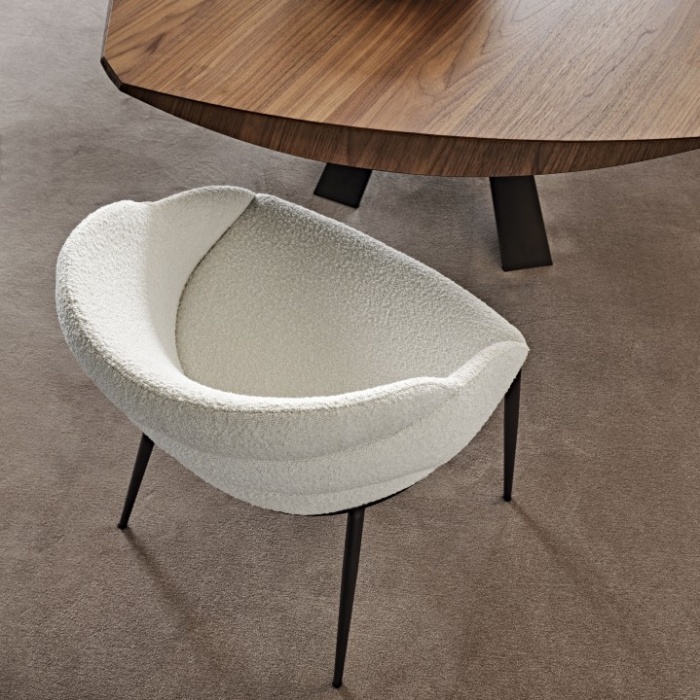 Infine, completa la famiglia la poltrona girevole moderna Camilla Lounge con la sua ampia seduta tondeggiante e la sua base metallica che ne snelliscono la figura generosa. Questa poltrona è anche disponibile in versione fissa, con struttura a quattro gambe metalliche.
