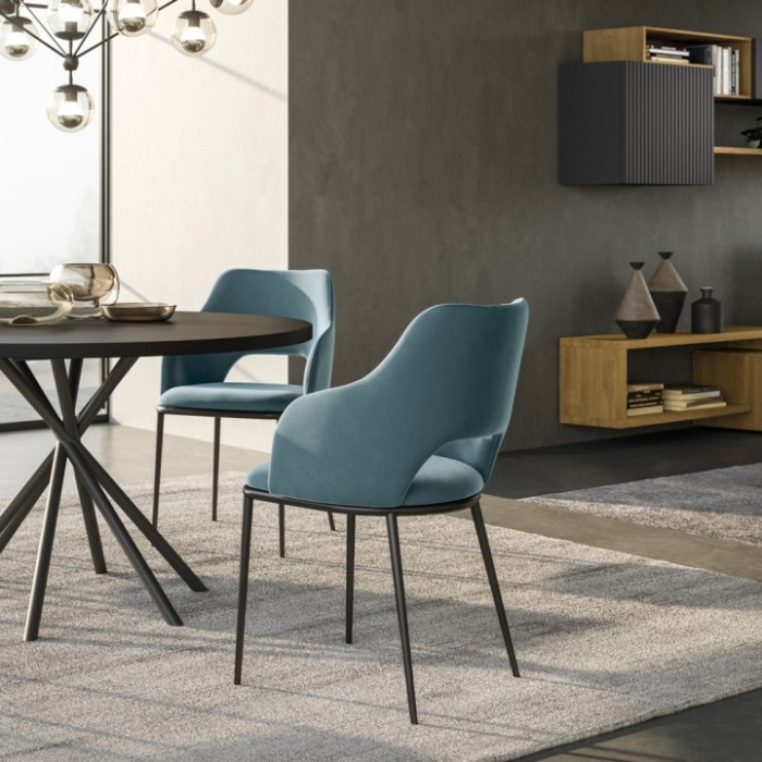 La sedia Diva di FGF Mobili con struttura in metallo conificato è una poltroncina dal design moderno e sofisticato. La scocca imbottita, dotata di braccioli integrati e di un'elegante apertura sullo schienale, offre un'esperienza di seduta ergonomica e avvolgente. Le gambe in metallo, assottigliate tramite un particolare processo produttivo, conferiscono leggerezza visiva senza sacrificare la stabilità. Ideale per living contemporanei, è personalizzabile con una vasta gamma di rivestimenti in velluto, ecopelle o microfibra.