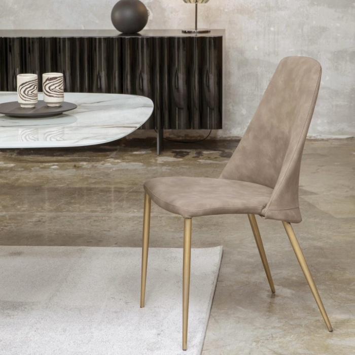 Il tratto distintivo della sedia Elmo è la particolare struttura dello schienale, che richiama nella parte inferiore un guscio avvolgente, realizzato in pelle o tessuto, pensato per offrire un’esperienza di seduta estremamente confortevole. Questa forma unica non è solo estetica, ma anche funzionale, poiché sostiene la schiena in modo ergonomico e dona un senso di accoglienza. Il design della seduta decisa si fonde armoniosamente con le sottili e raffinate gambe in metallo, disponibili in diverse finiture, che slanciano visivamente la struttura e aggiungono un tocco contemporaneo all’insieme.