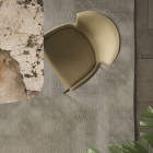 La scocca e la seduta sono ricche di dettagli sartoriali, realizzati con la massima cura e precisione. Lo schienale presenta una forma poligonale, caratterizzata da spigoli smussati e dolci curve, che si unisce con fluidità alla seduta. Quest'ultima è arcuata verso l'alto e permette di avvolgere il corpo dando il massimo del comfort. Ai lati, un bordo imbottito delimita il morbido cuscino e accentua ulteriormente l'aspetto confortevole di questa sedia di design imbottita.
