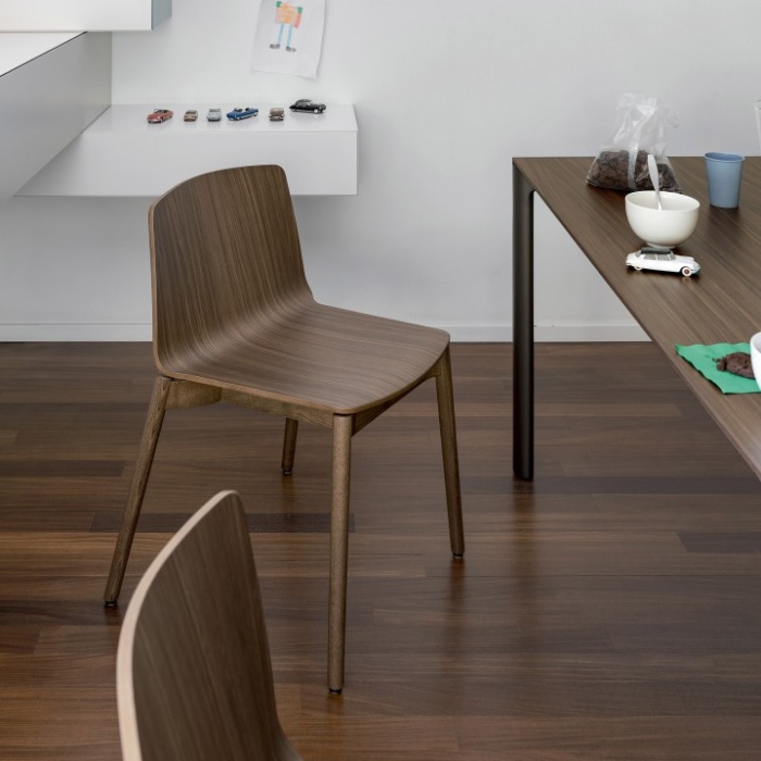 Il progetto si distingue per una struttura solida in legno massello, che dona calore e robustezza alla seduta.A questa si abbina una scocca ergonomica in multistrato curvato o in polipropilene stampato a iniezione, a seconda delle esigenze estetiche e funzionali.