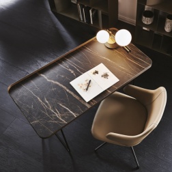 Tra i tavoli troviamo due modelli: Skyline Keramik e Skyline Wood. Sono rispettivamente un tavolo in ceramica di design con piano in diverse tonalità di raffinata ceramica effetto marmo, e un tavolo in legno moderno realizzato in pregiate essenze.