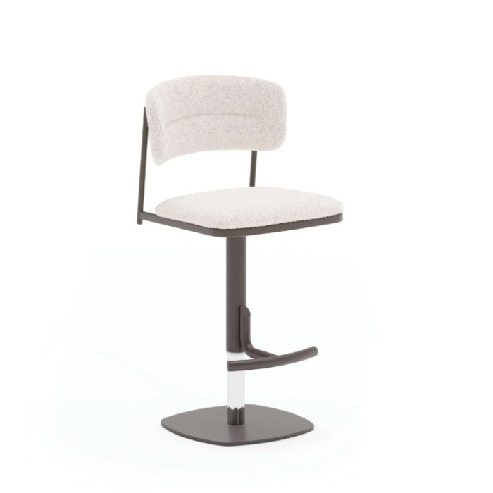 La struttura è sostenuta da una base in metallo resistente, dotata di un poggiapiedi integrato, che assicura stabilità e comfort aggiuntivo. Il suo meccanismo di alzata a gas, consente di regolare l’altezza della seduta tra 58,2 e 84,5 cm, rendendo lo sgabello estremamente versatile, perfetto per essere utilizzato in cucine con isole o penisole, così come in ambienti commerciali come bar, ristoranti e lounge moderne.