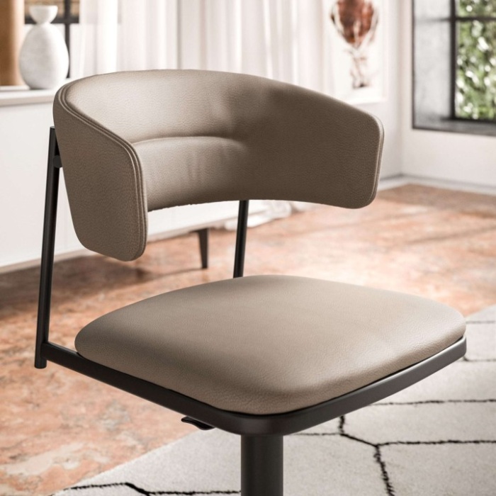 Lia è progettato con una base in metallo robusta e resistente, che assicura stabilità e sicurezza. Il poggiapiedi integrato offre un ulteriore supporto, migliorando il comfort e favorendo una seduta più rilassata. La seduta e lo schienale sono interamente rivestiti con varie finiture, permetendo di personalizzare lo sgabello in base allo stile dell’ambiente. Il rivestimento, disponibile in diverse varianti, dona una piacevole sensazione di morbidezza e accoglienza.Uno dei punti di forza di Lia è il meccanismo di regolazione dell’altezza a gas, che consente di modulare la seduta da 58,5 a 84,5 cm. Questa caratteristica lo rende perfetto per diversi tipi di piani, dai banconi da cucina agli spazi contract, garantendo sempre una seduta ergonomica e confortevole. Grazie alla sua forma compatta, Lia si inserisce armoniosamente in qualsiasi contesto senza risultare ingombrante.