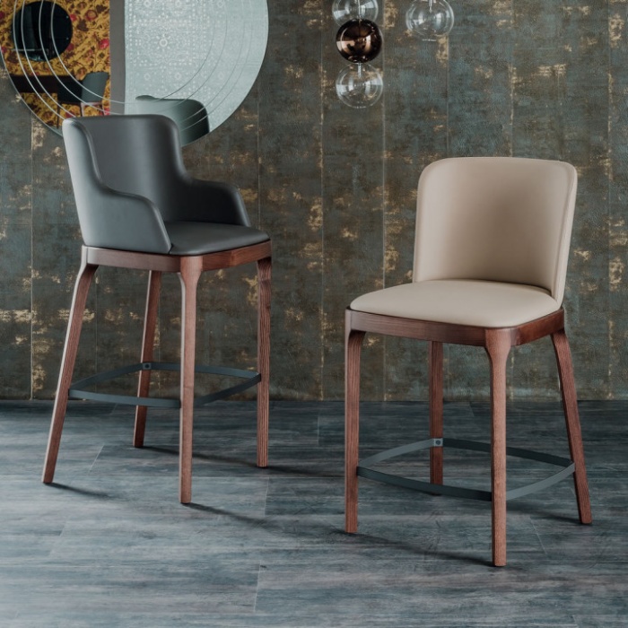 Il mod. Magda è caratterizzato da un robusto telaio in vero legno massello che delinea il design e una confortevole seduta con schienale e braccioli disponibile in tessuto, micro nubuck, ecopelle o pelle come da campionario. Dotato anche di un comodo poggiapiedi e disponibile in due altezze che lo rende particolarmente indicato per il piano cucina o piano snack. Ideale per un utilizzo frequente in ambienti domestici e/o commerciali quali bar o ristoranti.