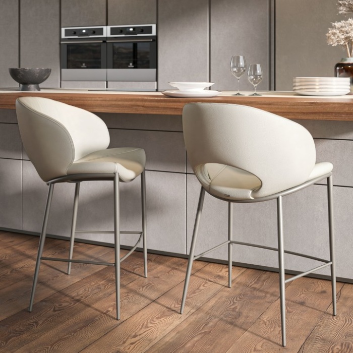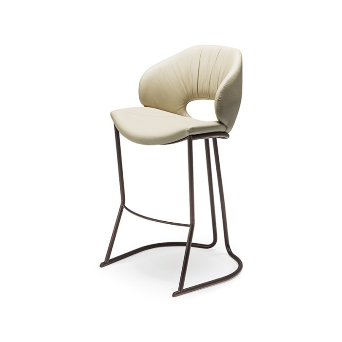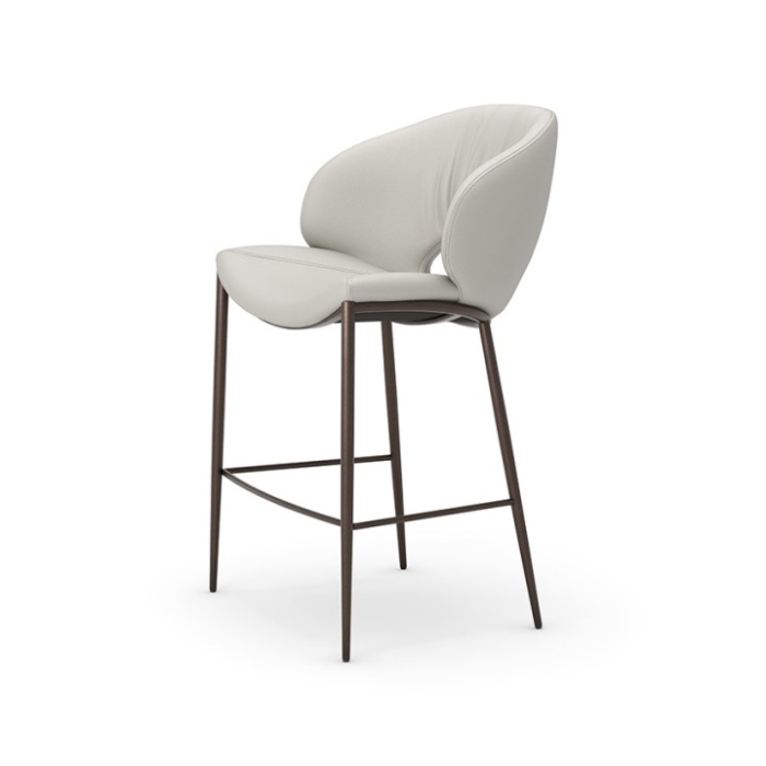 Sgabello con struttura in acciaio verniciato goffrato titanio (GFM11), bronzo (GFM18), graphite (GFM69), pearl (GFM70) o nero (GFM73). Rivestimento in tessuto, micro nubuck, ecopelle o pelle come da campionario. Non sfoderabile.