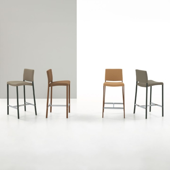 Struttura in metallo verniciato con poggiapiedi cromato e seduta rivestita in morbido tessuto Clean-Touch nei colori come da campionario.