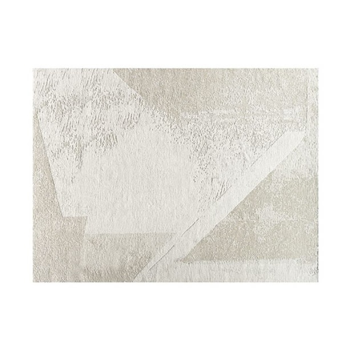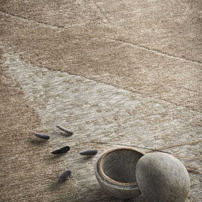 Tappeto tessuto in cotone, poliestere ed acrilico con disegno in rilievo in lana, nei colori Ivory (01) o Beige (02).