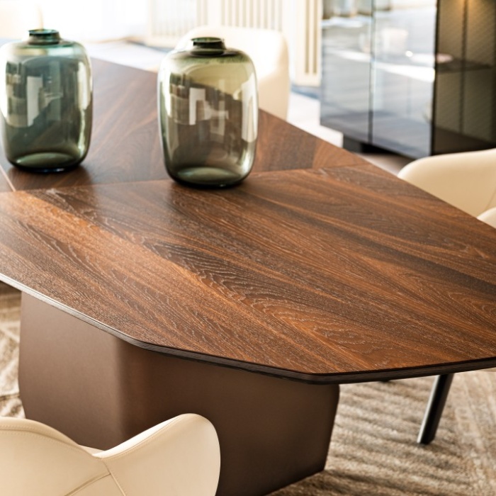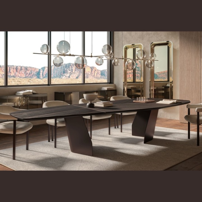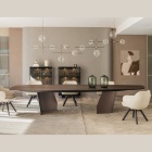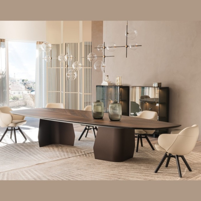 Le versioni con piano rettangolare in legno e Ker-Wood sono composte entrambe da un'accoppiata di materiali. Il primo è costituito da un gioco d'incastri bilanciati. Si percepiscono a prima vista lo studio e la dedizione necessari a realizzare la sua silhouette ricca di personalità. Il secondo presenta invece un piano in legno con inserto in ceramica, che permette l'abbinamento tra una vasta gamma di essenze pregiate, ceramiche ricche di sfumature cromatiche e metalli che ne sottolineano lo stile contemporaneo. Entrambi i tavoli rotondi moderni della famiglia Senator hanno un forte carattere scultoreo, derivante dalle basi in acciaio di forma irregolare, e la capacità di stupire gli ospiti.