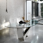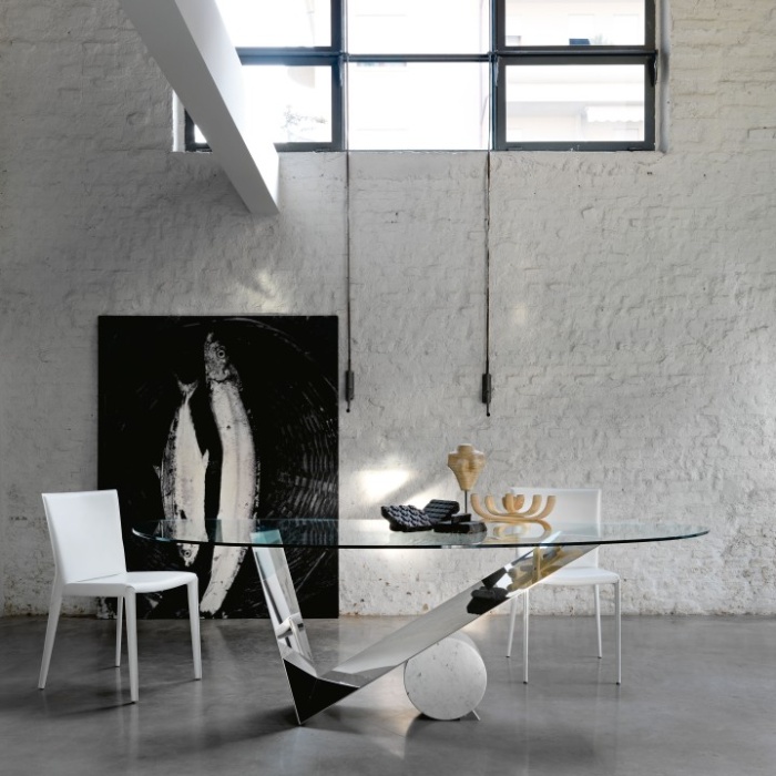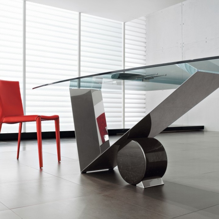 Il fulcro estetico di questo tavolo da pranzo moderno è la base, un vero gioco di pesi e contrappesi che si sostengono come in una composizione architettonica. Il piano in vetro, luminoso e trasparente, esalta la struttura sottostante e la rende protagonista dello spazio, valorizzando ogni contrasto materico.