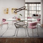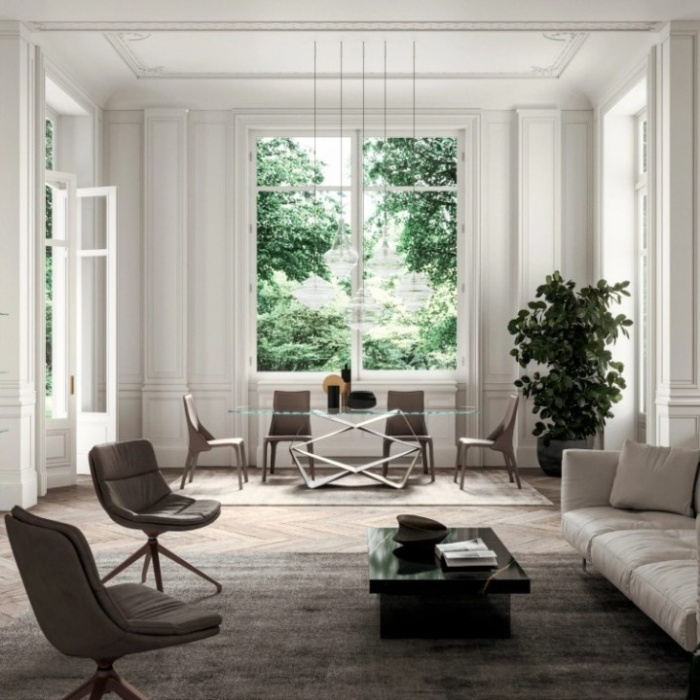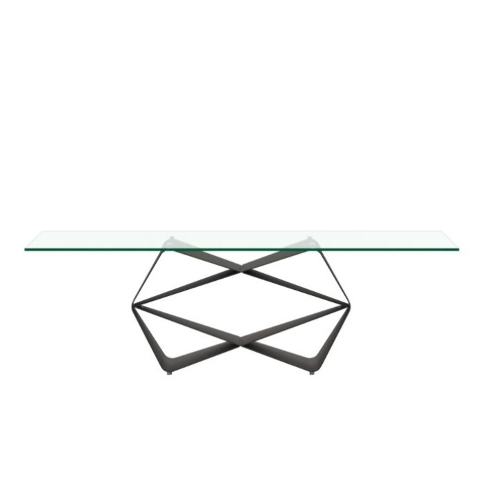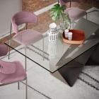 Il piano rettangolare di Gem è realizzato in cristallo, un materiale che dona al tavolo leggerezza visiva, luminosità e pulizia estetica.