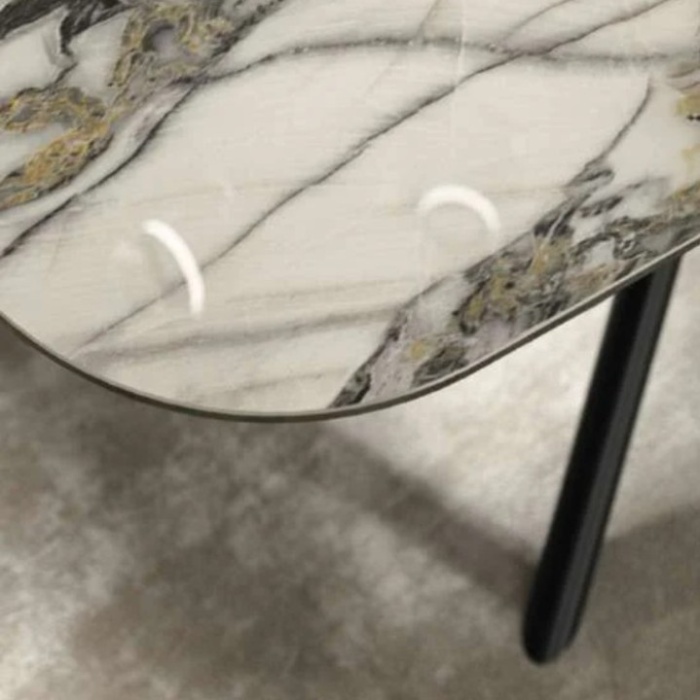 La base è composta da una struttura architettonica in tubi metallici, disposti in un intreccio geometrico dall’effetto scultoreo. Le saldature a vista e le giunzioni a vite ne sottolineano l’anima industriale, in contrasto raffinato con la raffinatezza del top. Uno degli aspetti più pratici è la presenza di piedini regolabili in altezza, che consentono al tavolo di adattarsi facilmente a qualsiasi tipo di pavimento, anche in presenza di leggere irregolarità.
