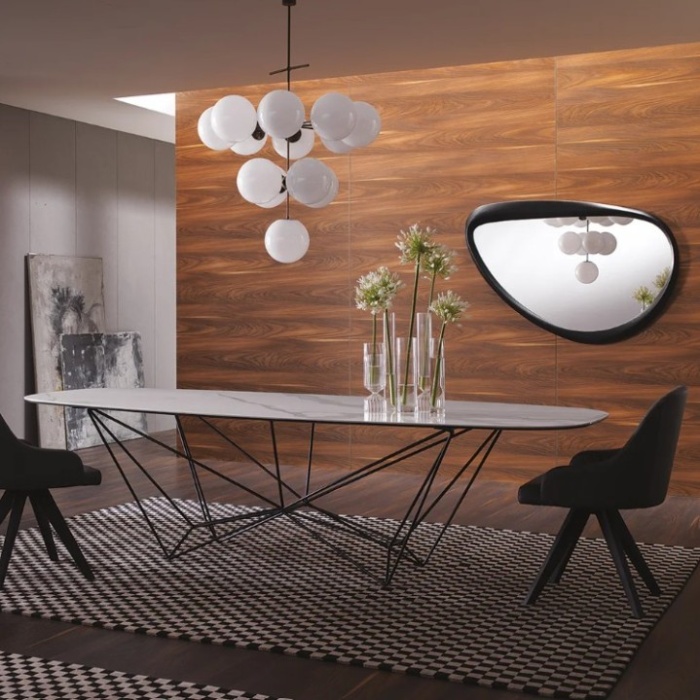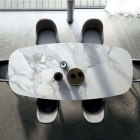 Il piano ovale, disponibile in ceramica o marble glass, è l’elemento che definisce l’identità estetica del tavolo.