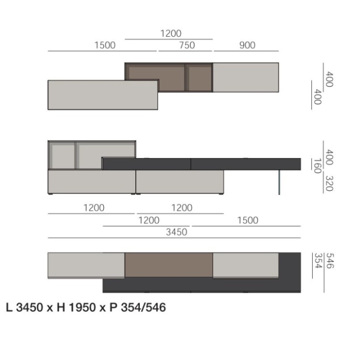 pensile TETRIS in materico Loto Terra in accostamento a pensili Lampo in materico Loto Tortora. Base Lampo e base TETRIS P 352 in materico Loto Tortora e base sporgente con cassetti P 546 in rovere tinto Carbone. Piede in metacrilato a sorreggere la base sporgente.