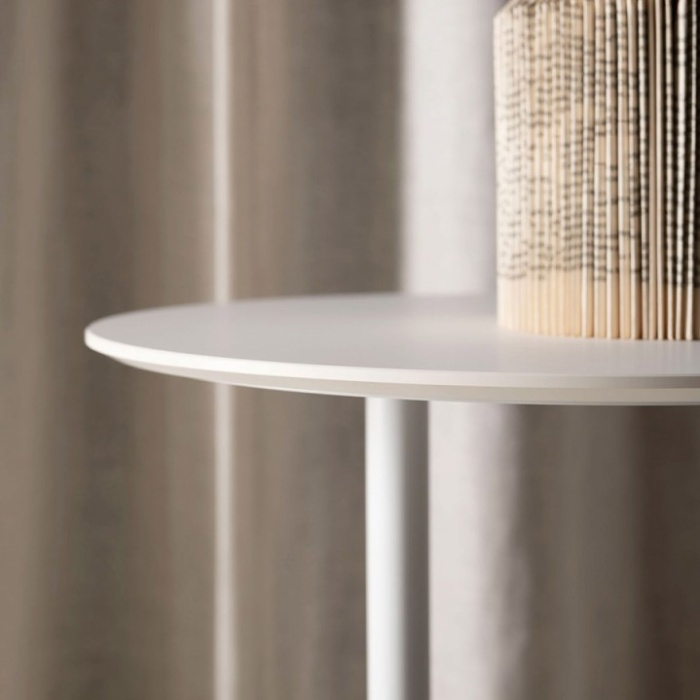 La sua particolarità risiede nell’equilibrio inaspettato: il piano, disponibile in forma tonda o rettangolare, è sorretto da un fusto sottile e decentrato, che crea un effetto dinamico e leggero.