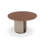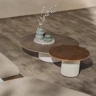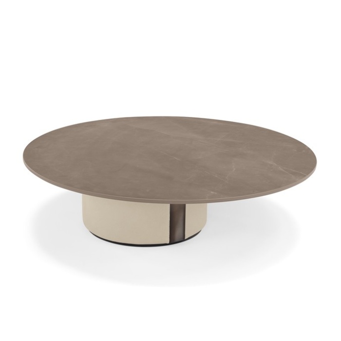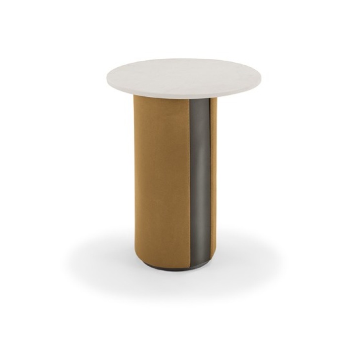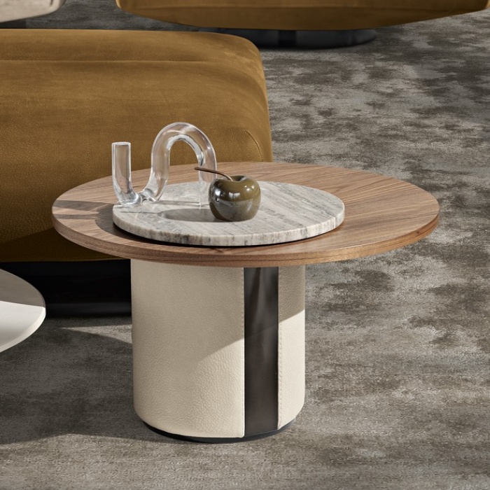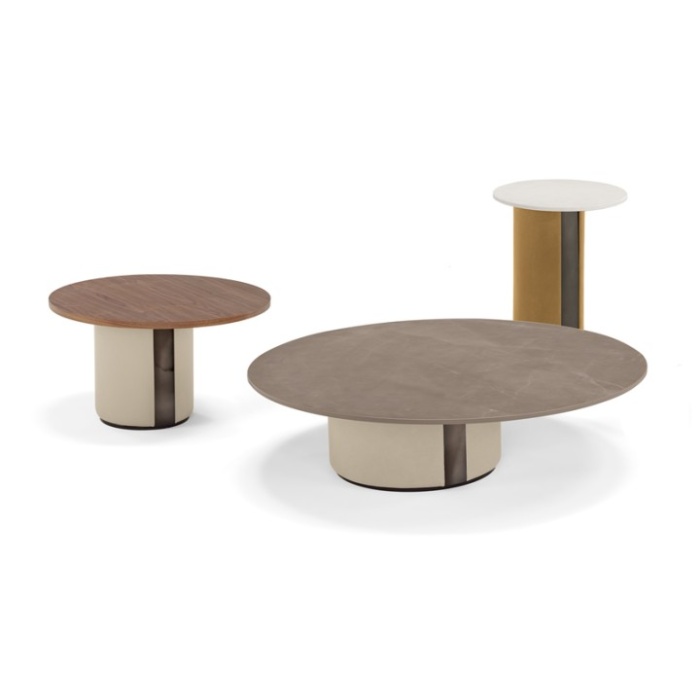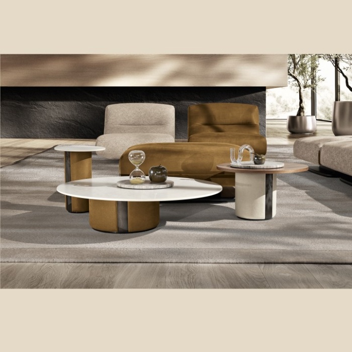 Le sue linee armoniose valorizzano un mix ricercato di materiali: i ripiani in gres e legno creano un contrasto visivo sofisticato, mentre le strutture rivestite in tessuto o pelle assicurano comfort tattile e resistenza nel tempo.