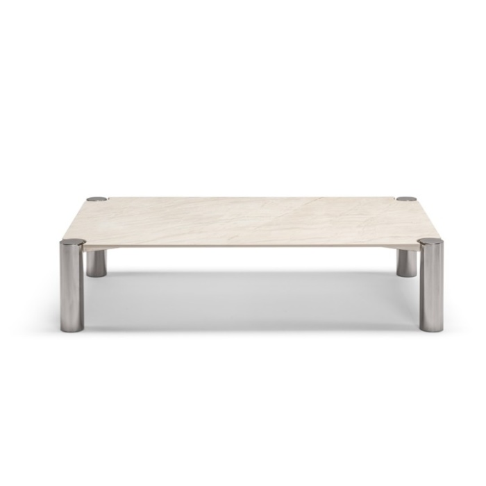 Il suo punto di forza è il gioco di contrasti materici: il ripiano in gres, solido e dal tocco setoso, si sposa con la leggerezza dei piedini tubolari in metallo.
