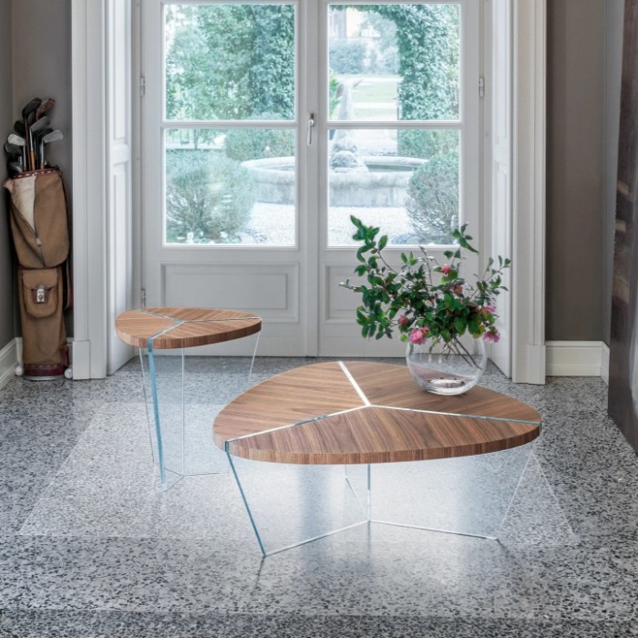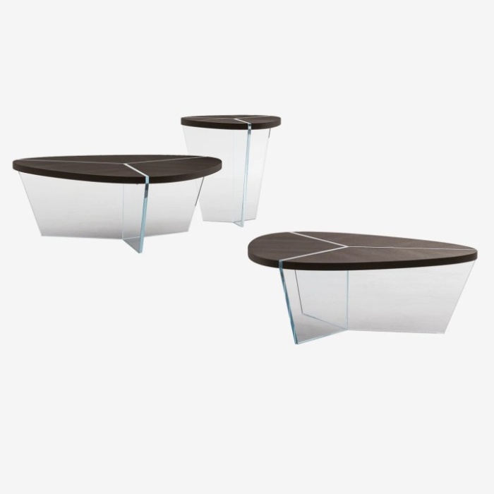 Il tavolo Aida nasce dall’incontro armonioso di materiali diversi, proprio come un legame forte che unisce opposti complementari. La sua struttura si compone di una base in vetro trasparente, modellata in tre linee rigide che donano leggerezza e stabilità allo stesso tempo, creando un gioco di trasparenze elegante e raffinato. A contrasto, il piano tondeggiante è rivestito in legno noce canaletto o in rovere scuro termotrattato, due essenze pregiate che conferiscono calore, matericità e prestigio.
