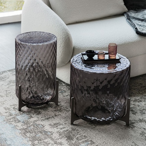 I tre supporti che costituiscono le gambe hanno una forma acuminata che contrasta con le rotondità del tavolino di design. Anche grazie a questo dettaglio, l'effetto generale ha un gusto retrò adattato allo stile contemporaneo. Questo tavolino è espressione della grandiosità della lavorazione manuale del vetro.