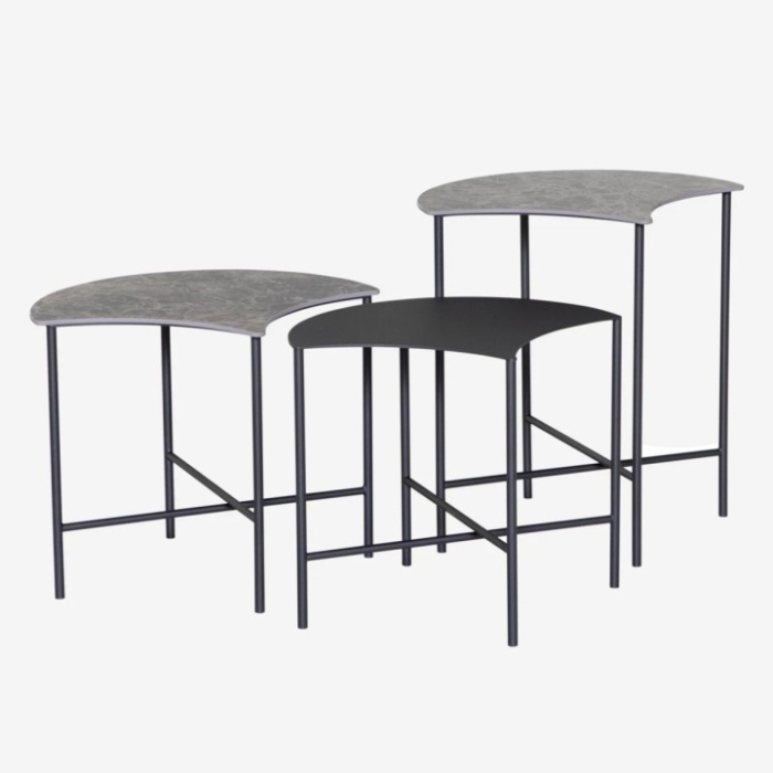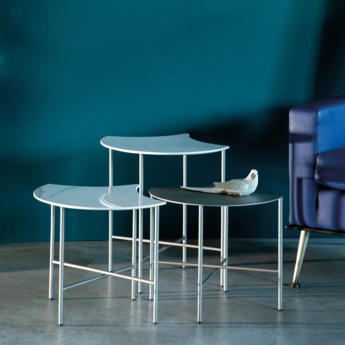 I tavolini Ginco si distinguono per il loro design ispirato alla natura, in cui leggerezza e raffinatezza si fondono in un complemento d’arredo unico e scenografico. La struttura, realizzata in tubolare metallico leggero, conferisce stabilità senza appesantire la composizione, mentre il top a forma di ventaglio richiama con eleganza la silhouette della celebre foglia di Ginkgo, simbolo di armonia e longevità. Questa scelta stilistica dona ai tavolini un carattere distintivo, capace di arricchire con naturalezza ogni ambiente, dal living moderno agli spazi più classici.