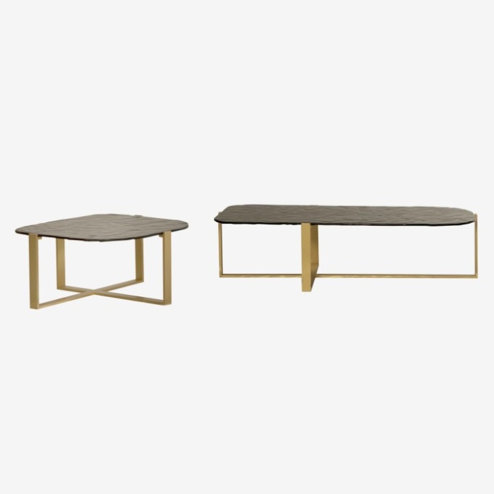 Il set di tre tavolini Ocean con base ad intreccio in metallo rappresenta un perfetto equilibrio tra geometria e natura, unendo rigore formale e suggestioni organiche. La finitura oro matt della struttura dona luminosità e raffinatezza, mentre i top in vetro fuso color fumè catturano l’attenzione con le loro leggere increspature superficiali, che evocano il movimento armonioso dell’acqua. Questo contrasto tra le linee minimali della base e la matericità del vetro crea un gioco visivo unico e prezioso, capace di arricchire con personalità qualsiasi ambiente.