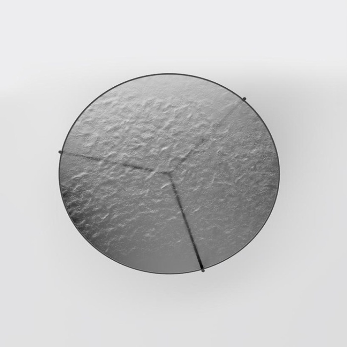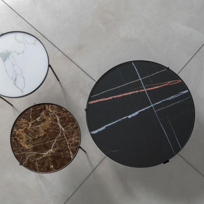 La sua struttura in tondino pieno di acciaio dal diametro di 10 mm, con finitura sablé, conferisce al tavolino solidità, mantenendo al contempo un aspetto visivamente leggero e arioso.
