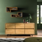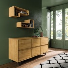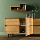 Le finiture di serie celebrano la naturalezza della materia con la tonalità Oak a poro aperto, ma è possibile personalizzare il mobile con laccature a poro chiuso in Snow, Antracite o in qualsiasi colore della scala RAL per i pannelli esterni o il telaio interno. Di serie, la madia poggia su piedini regolabili a scomparsa in polipropilene (H. 4,5 cm), ma può essere configurata con diversi basamenti opzionali in metallo (modelli Slitta, Conici, Lama, Quadro) o in vetro trasparente (H. 12 cm) per variarne lo stile e l'altezza complessiva .
