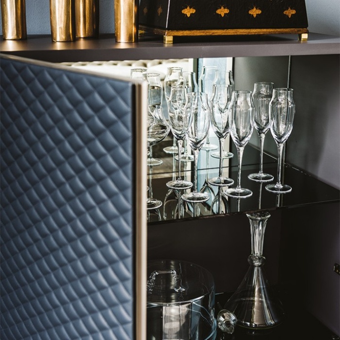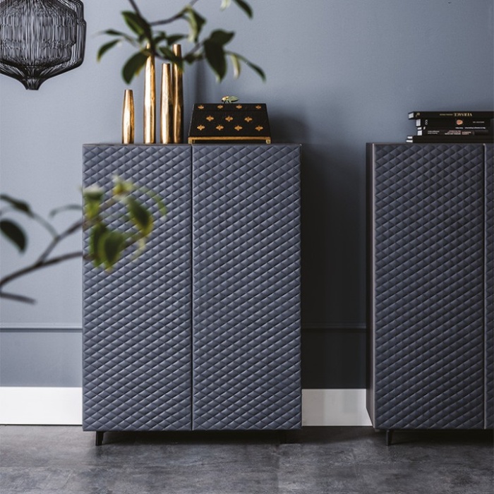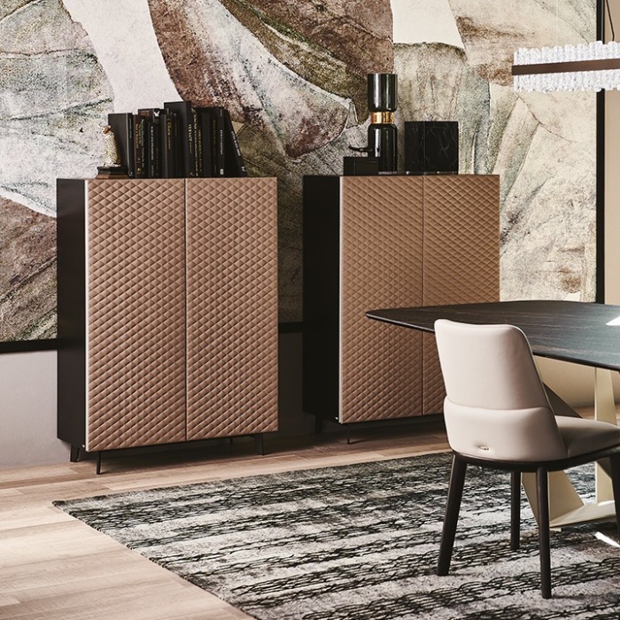 Realizzata con materiali di altissima qualità, Tiffany esprime appieno l’eccellenza della manifattura italiana. La trapuntatura dona profondità e ritmo alle superfici, creando un raffinato gioco di luci e ombre che valorizza i volumi verticali della struttura. Le proporzioni slanciate rendono questa credenza ideale sia come elemento funzionale, grazie all’ampia capienza interna, sia come pezzo decorativo capace di caratterizzare l’ambiente.