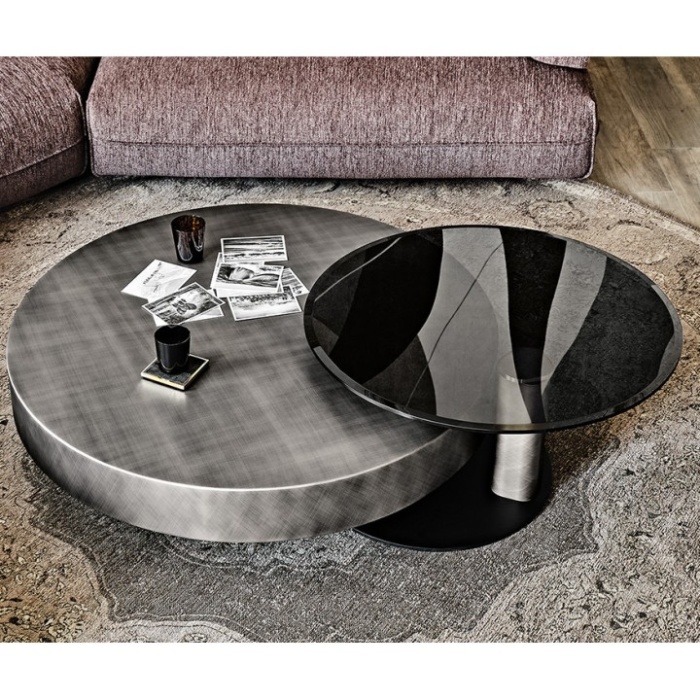 Il designer Yasuhiro Shito ha pensato ad ogni dettaglio per un risultato dal forte impatto estetico che non trascura la funzionalità di un piano d'appoggio spazioso. Questo tavolino moderno viene proposto in 3 modelli, ma in un totale di 6 varianti. Arena è un modello rotondo che può essere completato da uno o due tavolini rotondi di vetro girevoli che affiancano il piano principale: Arena Bond e Arena Double Bond.