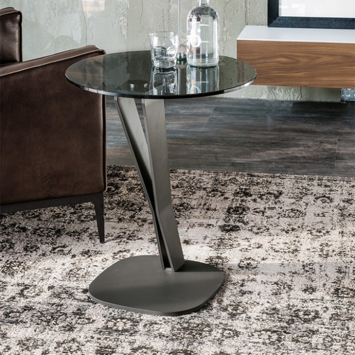 A impreziosire l’insieme interviene il piano rotondo in vetro, disponibile nelle versioni trasparente oppure fumé, che crea un raffinato gioco di contrasti tra matericità metallica e leggerezza visiva. Questo equilibrio tra robustezza e delicatezza rende il tavolino Falco un elemento capace di integrarsi facilmente sia in ambienti minimalisti sia in contesti più ricercati, valorizzando la composizione del living senza appesantirla.